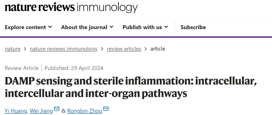 2024年4月29日,合肥综合性国家科学中心大健康研究院资深研究员周荣斌、研究员黄亿等受邀在Nat Rev Immunol 期刊上发表了一篇题为DAMP sensing and sterile inflammation: intracellular, intercellular and inter-organ pathways 的综述,系统总结了免疫系统如何感知来源于自体细胞、周边细胞或远端组织和器官的DAMPs并诱导无菌性炎症,并讨论了靶向DAMPs或其相应受体治疗炎症性疾病的干预策略。
