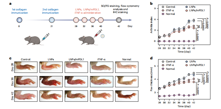 在上述基础上,研究团队搭建Ⅱ型胶原免疫诱导的RA模型里,以此来验证LNPs/mPDL1的治疗效果。当这些小鼠接受LNPs/mPDL1治疗之后,通过评估发现其关节肿胀评分明显下降。通过番红固绿染色及滑膜免疫组化分析发现,LNPs/mPDL1治疗显著缓解了胶原诱导性关节炎(CIA)小鼠的病理进展:其软骨损伤程度恢复至接近正常水平,滑膜组织中促炎因子IFN-γ和TNF-α表达显著降低,CD8?、CD4? T细胞浸润减少,同时调节性T细胞(Tregs)比例升高,表明治疗有效重塑了免疫稳态。此外,关节炎症评分显示LNPs/mPDL1的抗炎效果与TNF-α抑制剂依那西普相当,进一步证实该疗法通过靶向调控T细胞亚群及炎症微环境,在抑制自身免疫反应、促进软骨修复及骨保护方面展现出与现有临床疗法相当的潜力。