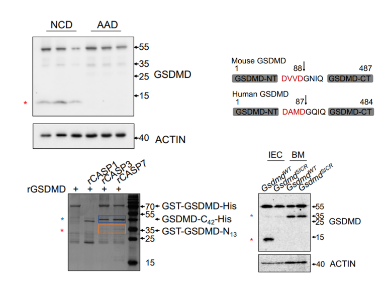 研究人员首先针对生理状态下各个组织细胞的GSDMD进行了蛋白印迹检测,发现检测的各组织样品中只有在小肠的IEC中能检测到一条大约13kD大小的剪切带,通过使用氨基酸水解食物(AAD amino acid diet)【6】,研究人员发现这一条剪切带来自GSDMD的N端并且是受到食物抗原诱导产生的。随后研究人员通过IP-MS技术并进行后续验证发现该片段是由食物抗原激活十二指肠IECs中的CASPASE-3/7切割GSDMD的88位天冬氨酸(人源GSDMD是87位)产生,并依此构建了GSDMD的小肠剪切突变GsdmdSICR鼠以进行后续研究(图一)。